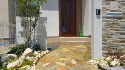 アプローチは自然石貼りの緩やかな曲線で、やさしい雰囲気のまま玄関へと導きます。