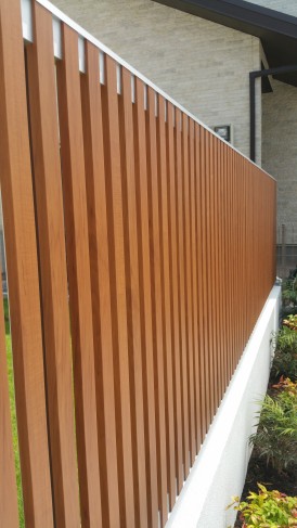 道路からの視線をやさしく遮る、木目調フェンスが印象的な外構プラン。