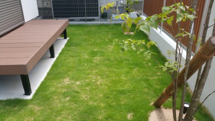 お庭には芝生とウッドデッキを設け、お子さまが安心して遊べる、のびやかな空間を計画しました。