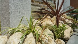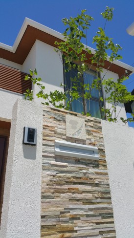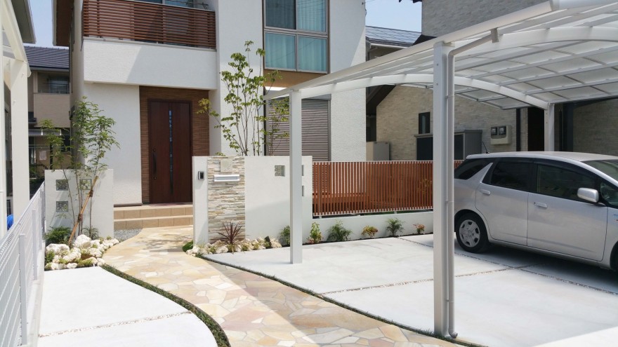 木目調フェンスと調和する目隠しや、自然素材の門柱、琉球石と植栽を組み合わせた足元の演出が、やさしく上質な外構をつくり出しています。