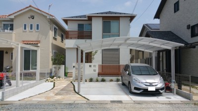 将来的なカーポート設置にも対応できるレイアウトとし、お子さまが安全に遊べるお庭空間を確保しています。