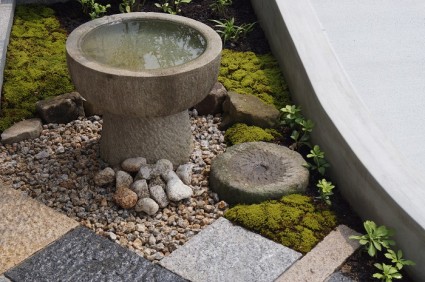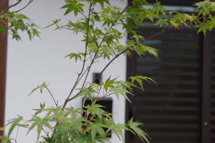 玄関先にはやさしい印象のイロハモミジを植え、和の植栽や庭石とともに、自然で心落ち着く空間を演出しています。