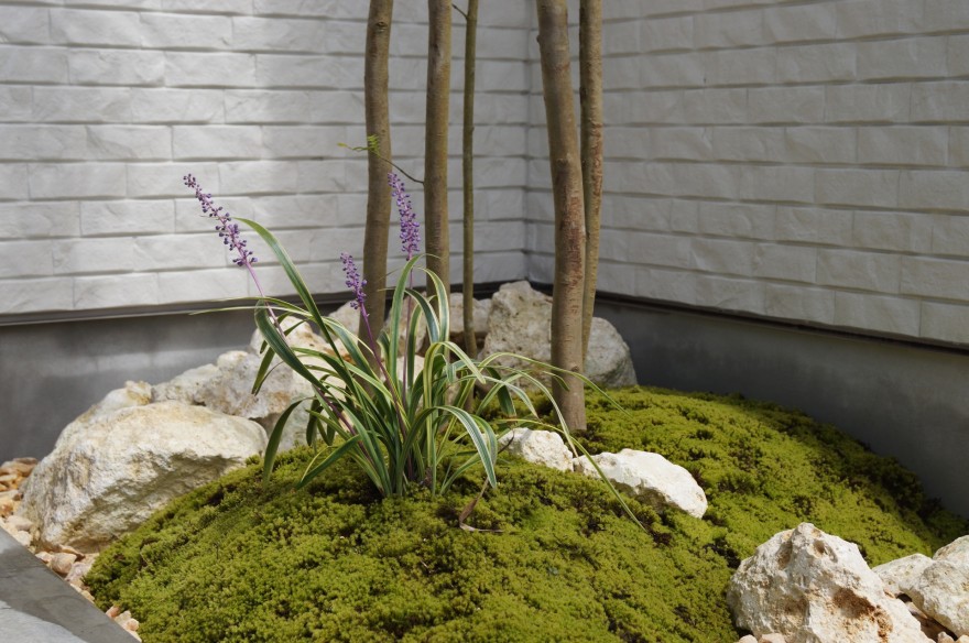 玄関まわりには、琉球石と苔で足元にも視線が集まる小庭を設け、モダンで洗練された印象に仕上げました。