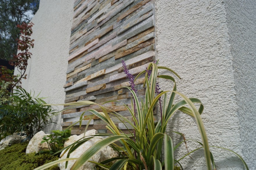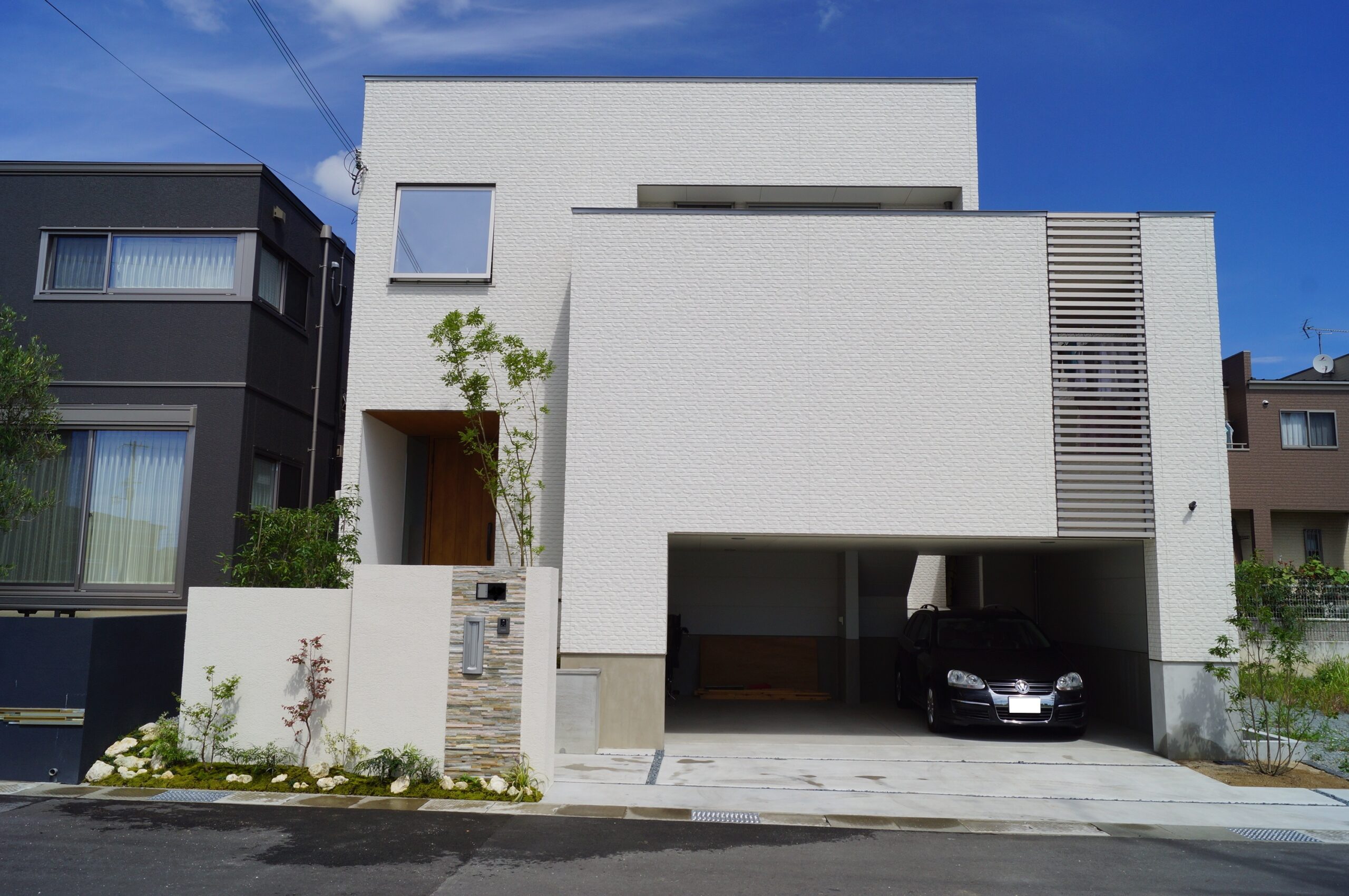 白を基調としたデザイナーズ住宅に合わせ、高さの異なる塀とナチュラルクオーツのボーダーラインをアクセントに採用。