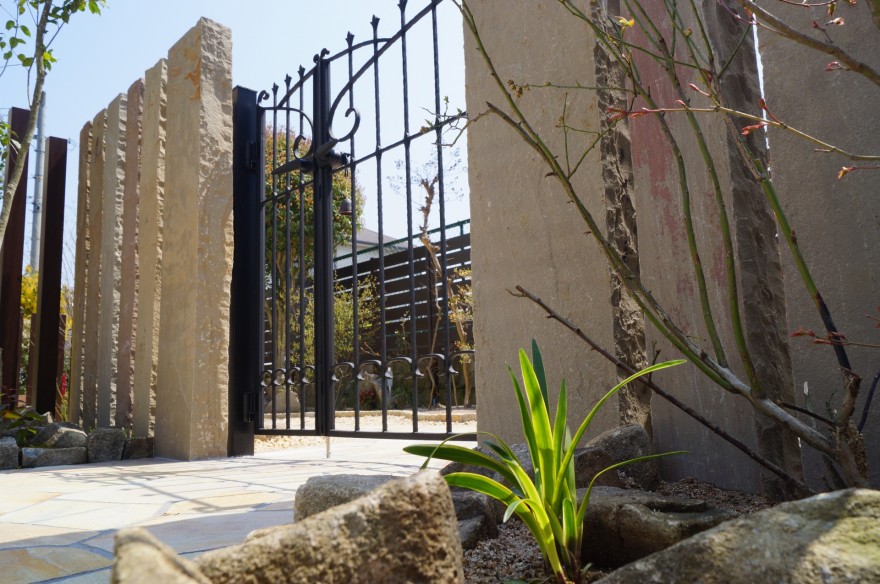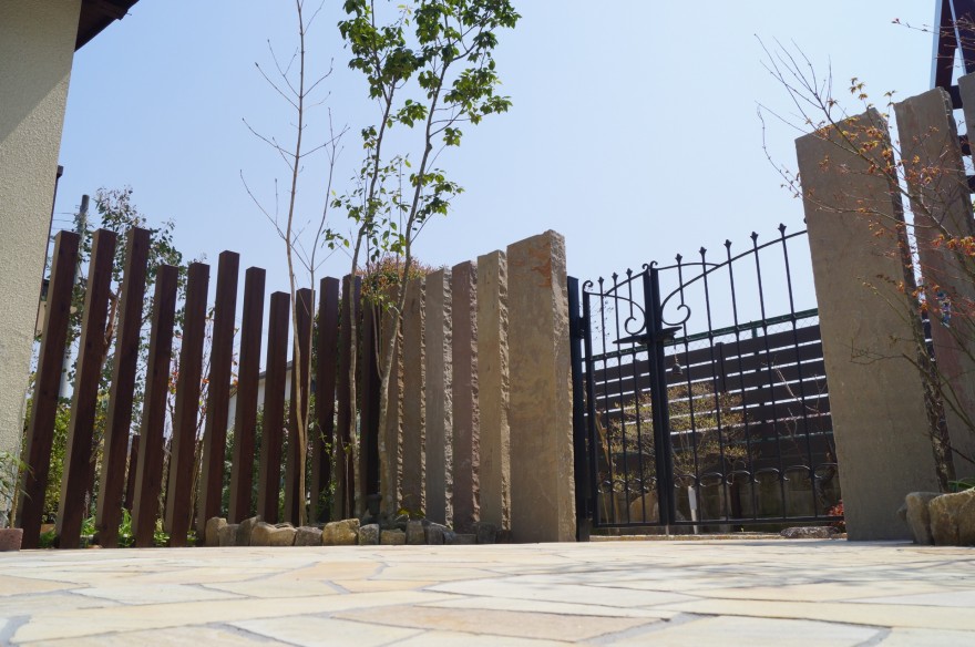 自然石ならではの風合いが美しいインド砂岩の石門柱に、ダークカラーのアルミ角柱を組み合わせた、ナチュラルで洗練された門廻り。