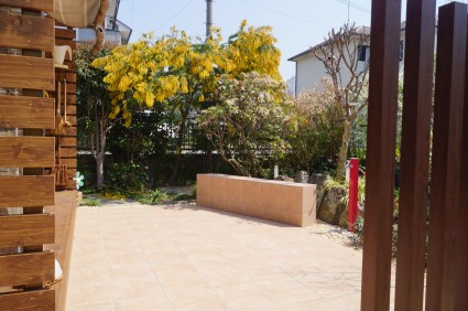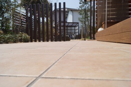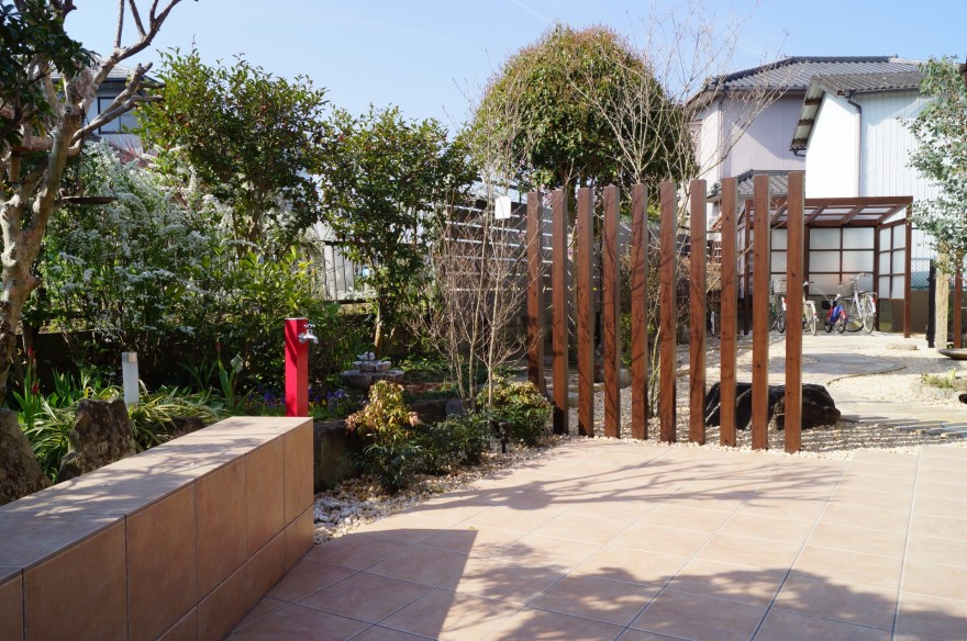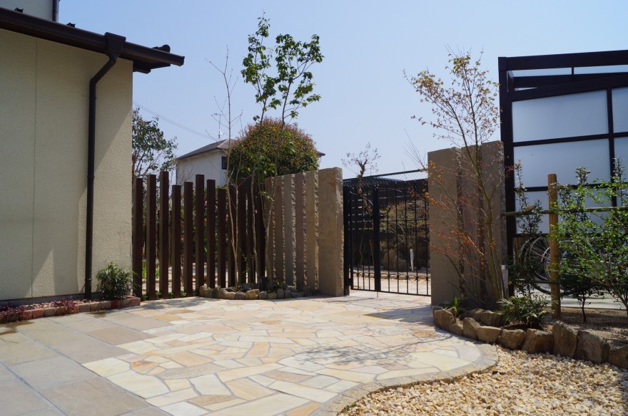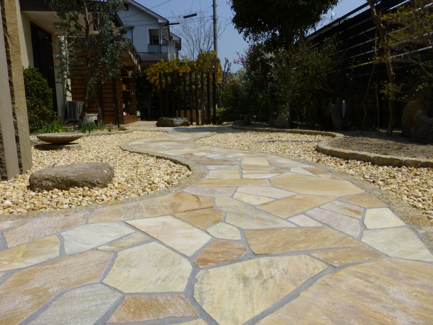 アプローチはピンコロ石で縁取った曲線ラインに乱形石貼りを施し、やさしい表情と奥行きを演出しています。