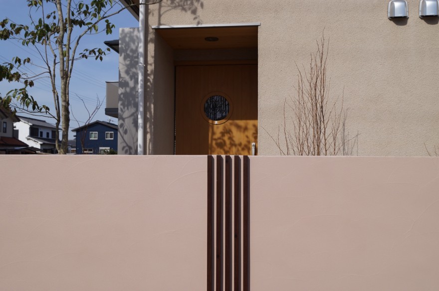 キューブ型のくり抜きを施した塗り壁と木目調の縦格子が、やわらかな和の印象を演出。