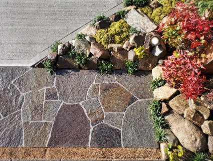 木調の横ラインに統一感を持たせた駐車場兼アプローチの自然石貼り。