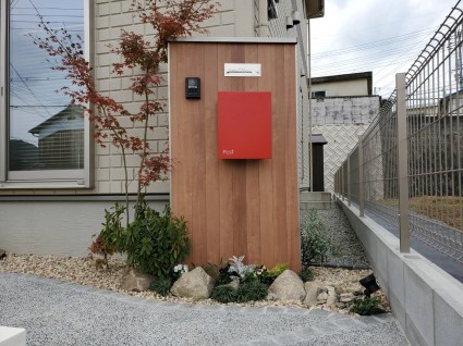 高台にある住宅において、目立ちにくかった従来の門柱を赤色ポストを配したデザインに変更し、住宅の顔として印象的でわかりやすい門廻りを実現。