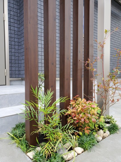 そこへ植栽をバランスよく取り入れることで、重厚感と落ち着きのあるワンランク上のエクステリアガーデンとして仕上げています。
