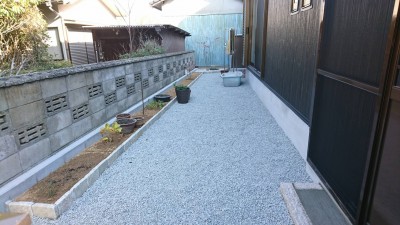 裏庭は全面を砕石敷きにし、すっきりと清潔感のある空間に。 水はけも良く、奥様のガーデニング用花壇も設け、趣味を楽しめる庭になりました。