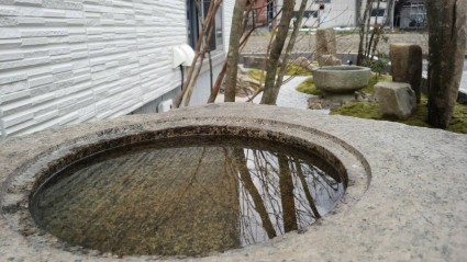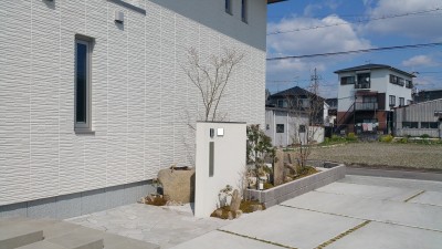 シンプルな門柱は少し下げて配置し、足元には植栽スペースを確保しました。 「街灯のない集落なので、夜のライトアップを楽しめるようにしてほしい」というご要望を受け、苔や石を引き立てるため、門柱はあえて控えめなデザインにしています。