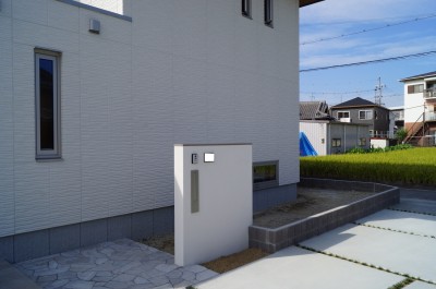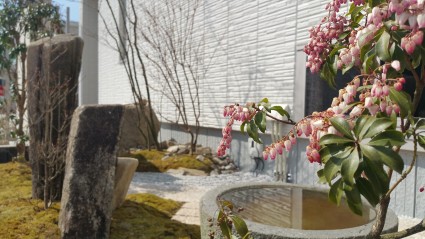 門柱の足元には自然石と砂苔をあしらい、立体感のある上品な坪庭を演出。 昼は馴染みよく、夜はミニポールライトとアッパーライトで柔らかく照らし出されます。 白い門柱に苔のグリーンが映え、アセビがさりげなく可憐な表情を添えています。