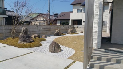 室内正面のお庭は、お孫さまが遊べるよう一部を芝生とし、成長に合わせて白川砂利の砂紋へと広げられる設えとしました。