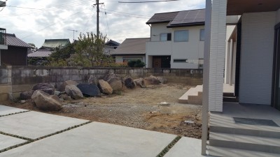 南側は広々としたくつろぎの庭に。 以前のお庭にあった庭石を活かし、タイルテラスからゆったり眺められる落ち着いた空間へ。 「シンプルな庭にしたい」というご要望に合わせ、余計な要素を省きながら趣を残しています。