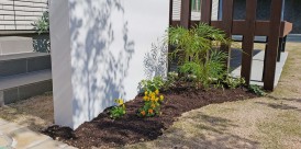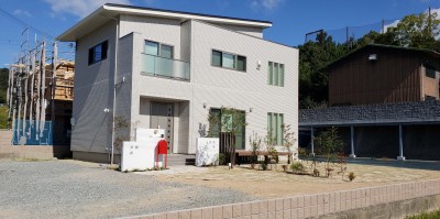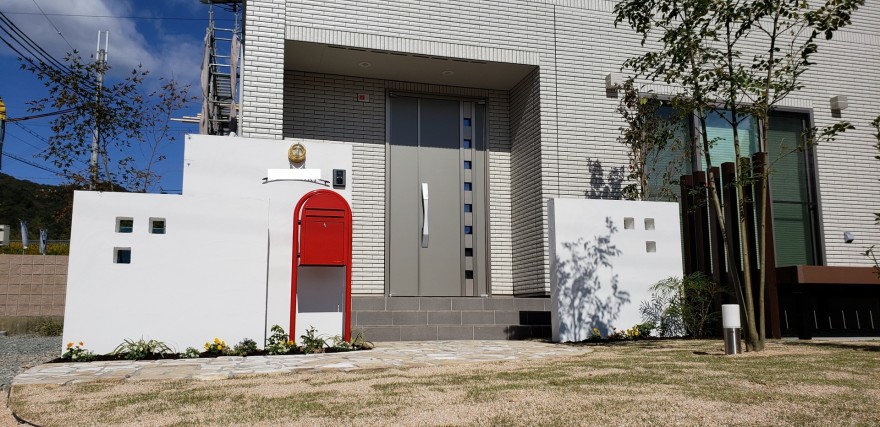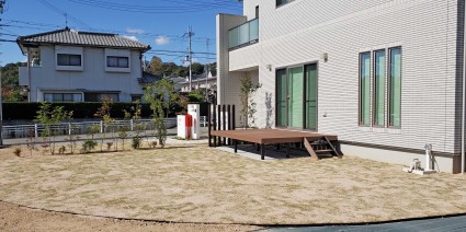 相生市にて、広い芝生と瑞々しい緑が心地よい外構が完成しました。