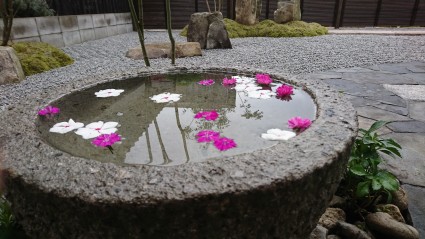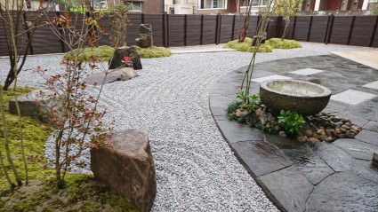 白川砂の砂紋が庭にリズムを生み、水に濡れると一層趣深く映えます。