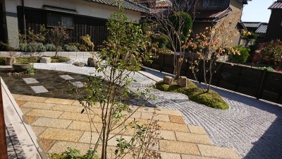 家族の団らんや地域の交流の場として、植栽や天然石、白川砂の砂紋が美しいコントラストを描くお庭に。