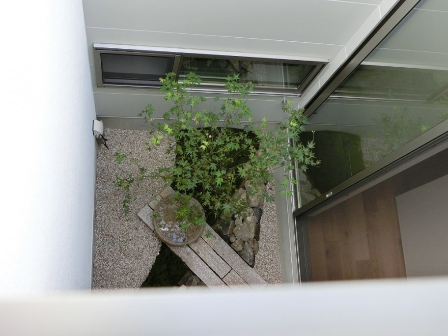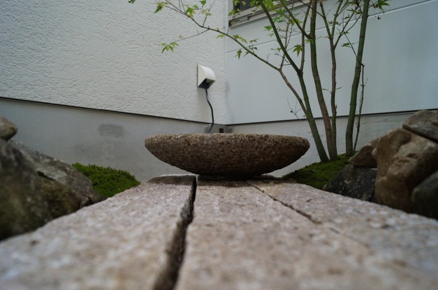 水鉢や伊勢砂利と調和し、ハイセンスな和モダン坪庭が完成しました。