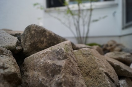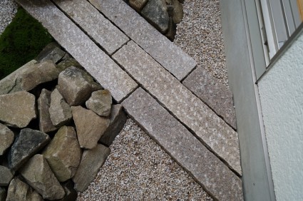 落ち着いた色合いの石材が表情豊かで、遠近感とモダンな雰囲気を演出。