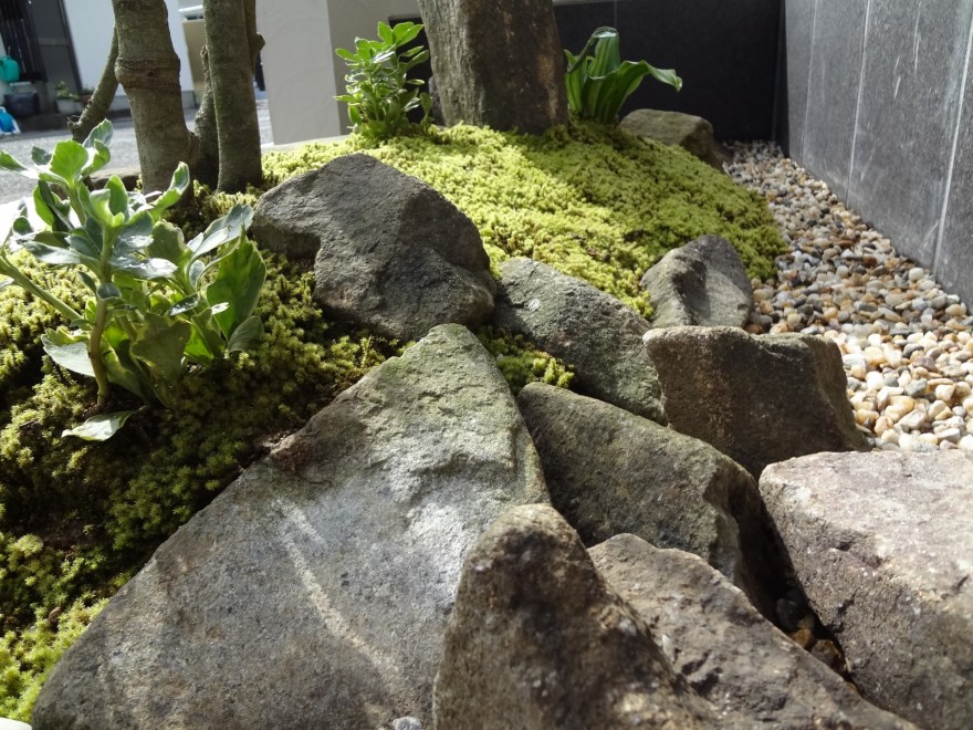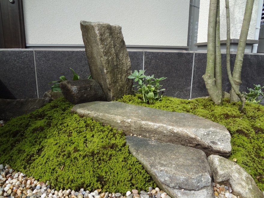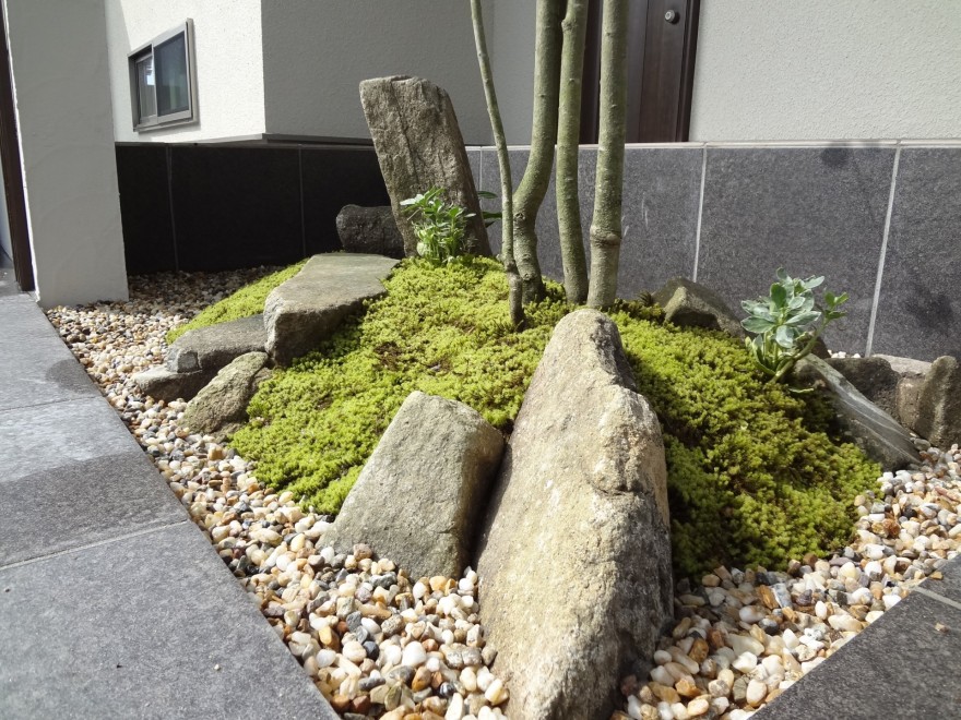 門前の小スペースに坪庭を設け、苔と自然石をバランスよく配置して趣ある空間に。