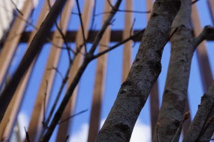 千本格子を背景に、ヤマボウシやドウダンツツジが自然に覆いかぶさるように枝を伸ばし、里山のような景色を演出。
