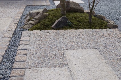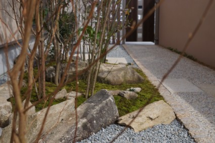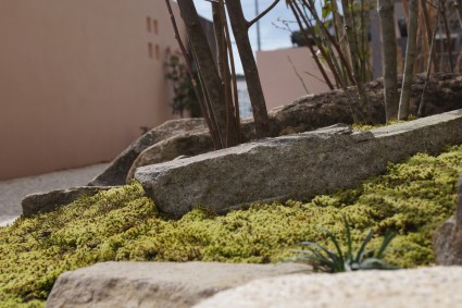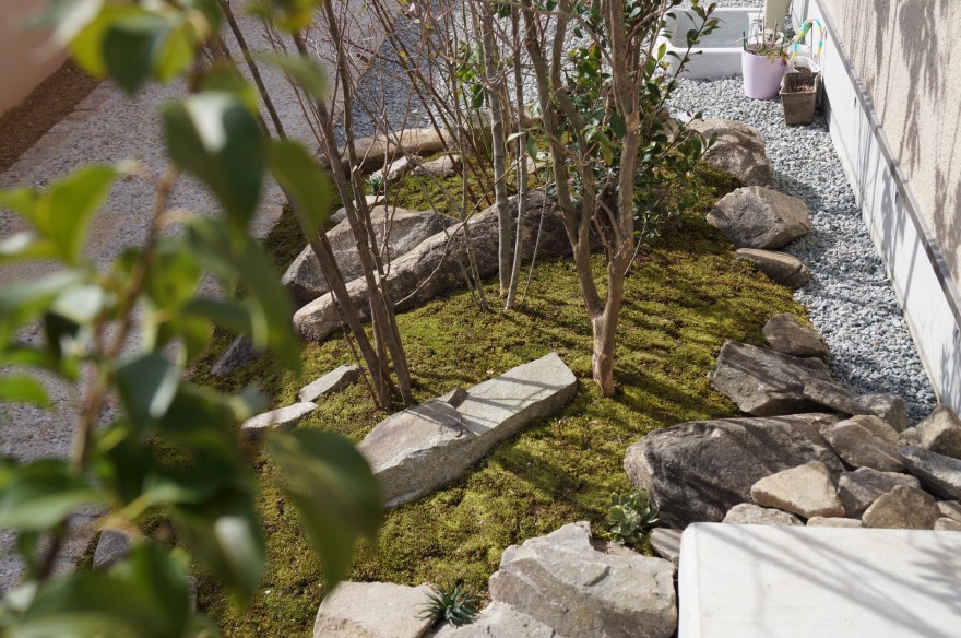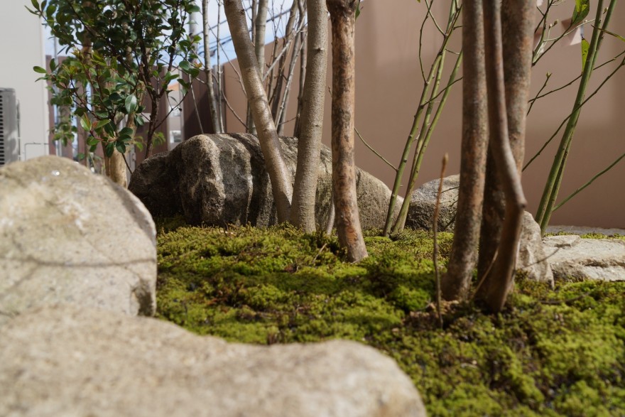 天然石の重厚感と苔の穏やかな緑が建物に寄り添い、経年変化も楽しめる落ち着きある空間に仕上がりました。