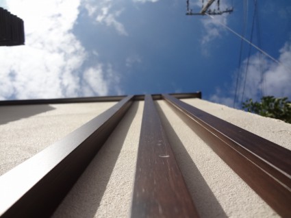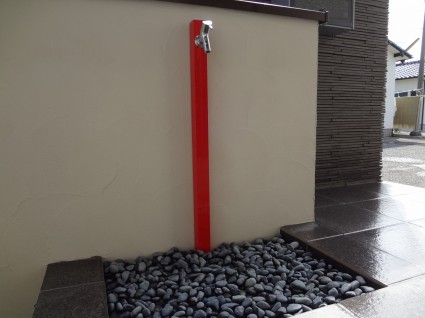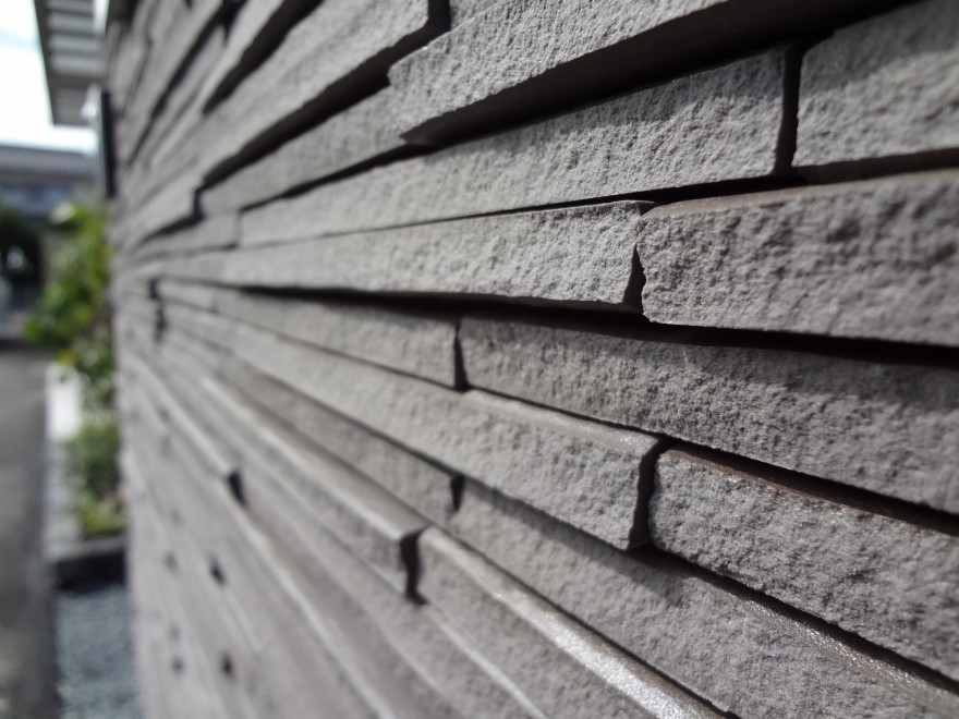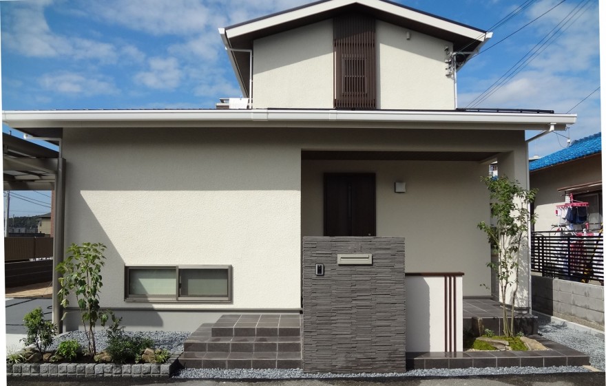 千陶彩の門柱と塗り壁が調和し、和モダンな趣をまとったファサードに坪庭を設えました。