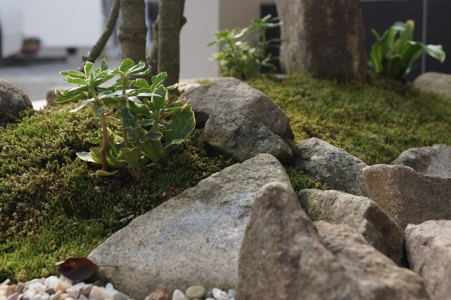 玄関横には、生野石の自然な表情と砂苔を活かした静かな庭が広がり、2.5mのソヨゴが一年を通してやさしく迎えてくれます。