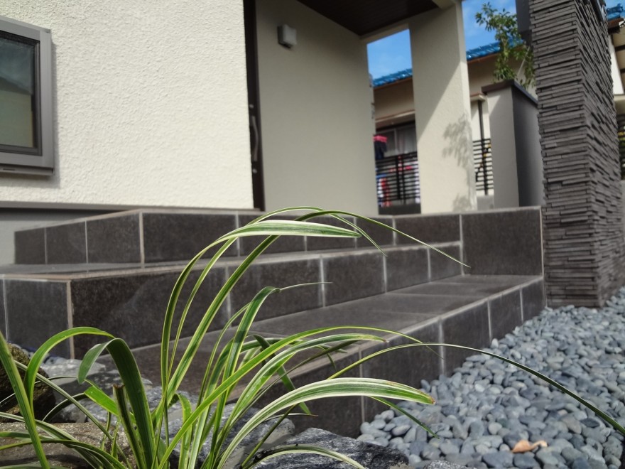 階段や坪庭には落ち着いた黒系タイルを用い、那智黒の玉石が和のアクセントとして全体を引き締めています。シンプルながら奥行きのある、美しい門まわりが完成しました。