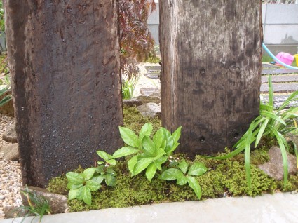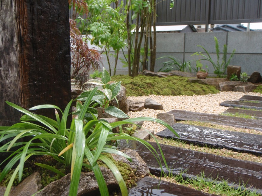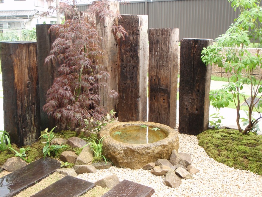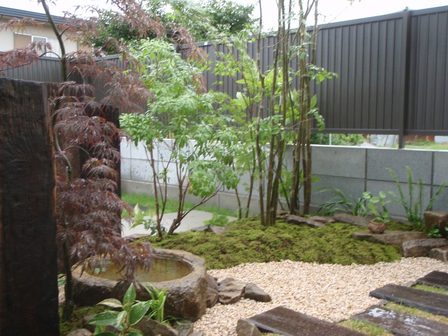 既存の水鉢や枕木も丁寧に再利用し、しだれモミジが水鉢へそっと寄り添うように枝を伸ばす姿が印象的。