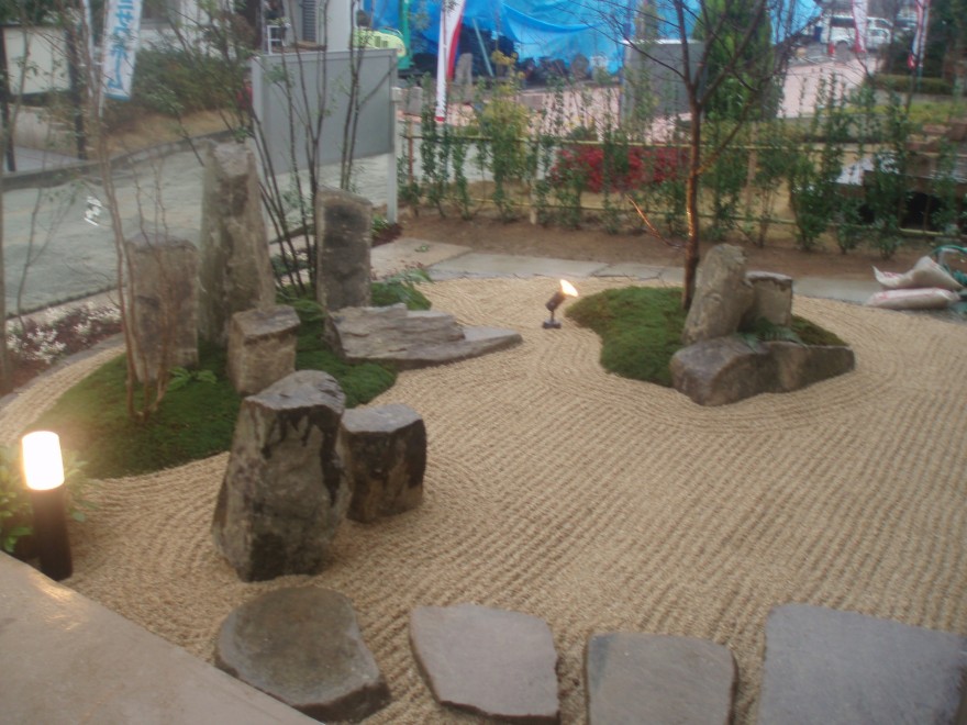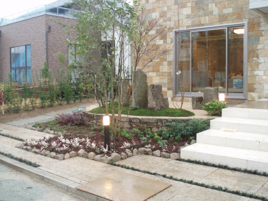 大きめの生野六方石を現代風に組み合わせ、どの角度からも鑑賞できる立体的な中庭をデザイン。