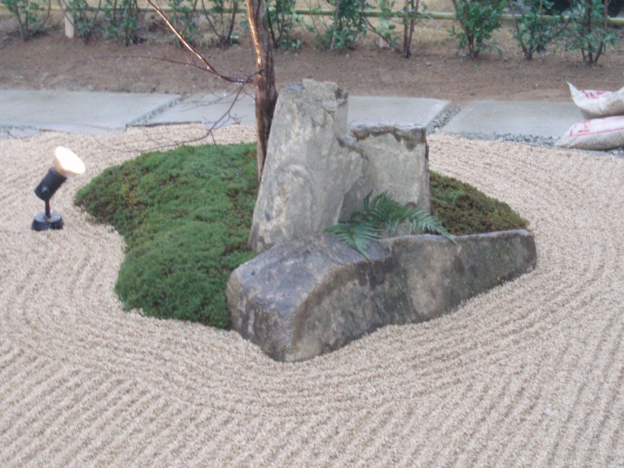 京都産の杉苔で築山をつくり、伊勢砂利で砂紋を描いた枯山水が、静けさと奥行きのある和の空間を演出しています。